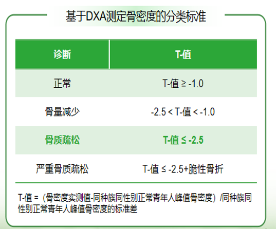 DXA骨密度是目前通用的骨质疏松症诊断依据,对于绝经后女性、50岁及以上男性,建议参照下表的诊断标准。