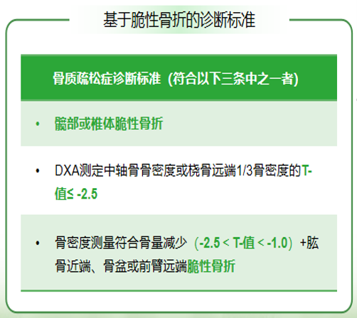 骨质疏松症的诊断标准包括双能X线吸收检测法(DXA) 骨密度测量和/或脆性骨折。
