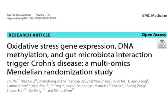 近日,中山大学附属第一医院消化内科陈旻湖教授、冯瑞教授团队的研究论文“Oxidative stress gene expression, DNA methylation, and gut microbiota interaction trigger Crohn’s disease: a multi-omics Mendelian randomization study”,以论著形式在国际知名学术期刊BMC Medicine(IF:11.15)杂志正式发表。中山一院陈旻湖教授、冯瑞副主任医师和胡世贤副研究员为该论文共同通讯作者,研究生徐舒和李晓智为共同第一作者,中山一院及糖心vlog (自治区人民医院东院)(简称中山一院广西医院)为通讯作者单位。