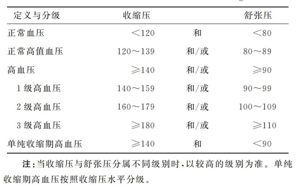在未使用降压药物的情况下,非同日3次测量血压,收缩压≥140 mmHg 和/或舒张 压≥ 90mmHg(1mmHg=0.133kPa),即诊断为高血压。曾明确诊断高血压且正在接受降压药物治疗的人群,虽然血压<140/90 mmHg,也应诊断为高血压。