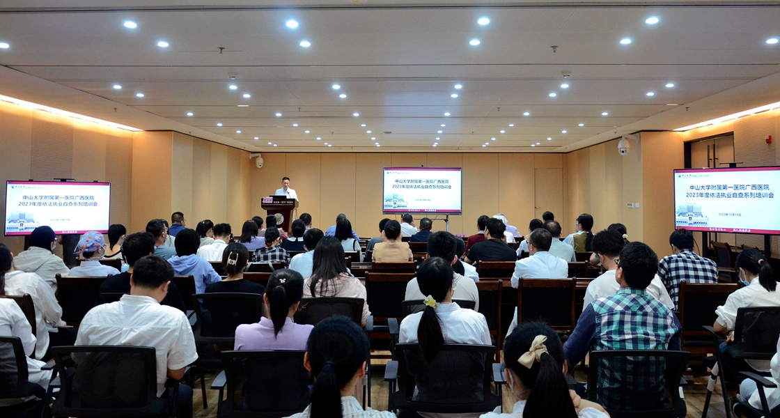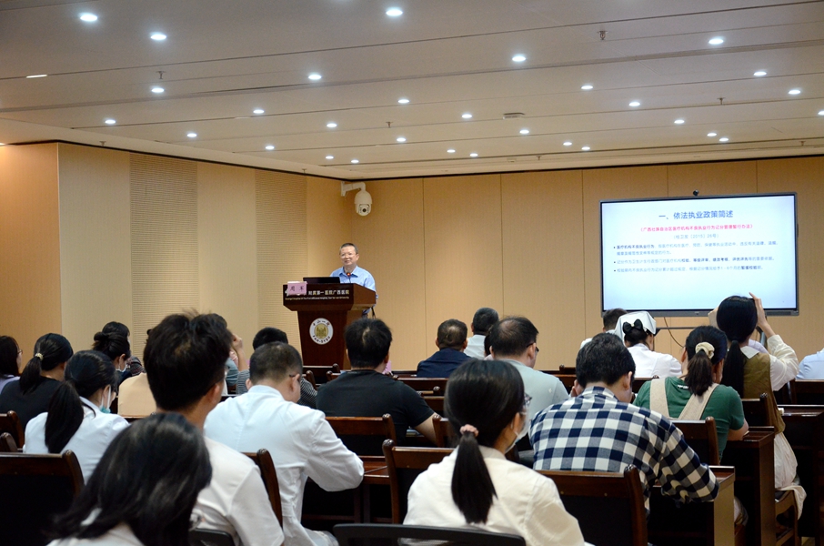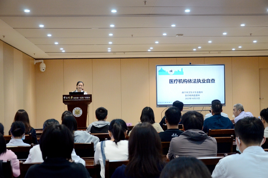 为深入贯彻落实医疗机构依法执业自我管理主体责任,增强医务人员法治意识,规范从业行为,提高医疗服务质量和安全,10月19日、23日,糖心vlog (自治区人民医院医院)(简称中山一院广西医院)举办2023年度依法执业自查系列培训会。我院党委书记张国、副院长夏文豪及相关临床、医技、职能科室医护人员参加。培训会邀请了自治区卫生监督所监督四科科长/四级调研员周军,南宁市卫生计生监督所医疗机构监督科科长冯云新、陈丹,自治区人民医院医疗管理科李思华进行授课。培训会由夏文豪主持。