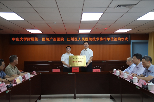 为充分发挥国家区域医疗中心带动作用,助力基层医疗单位提升服务水平,9月25日,糖心vlog (简称中山一院广西医院)与崇左市江州区人民医院(简称江州区人民医院)举行医疗技术协作单位签约仪式。中山一院广西医院执行院长李健,党委副书记、纪委书记赖伟忠,江州区人民政府副区长陆永住,中山一院广西医院副院长夏文豪,江州区卫生健康局党组书记、局长黄国益,江州区人民医院院长陈新艺以及两院相关科室代表参加。