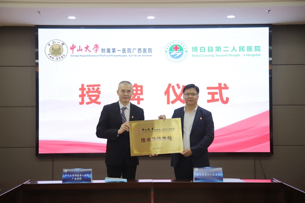 会上,杨超与李晨代表两院在活动上进行签约。杨超代表我院向博白县第二人民医院颁发技术协作单位牌匾。