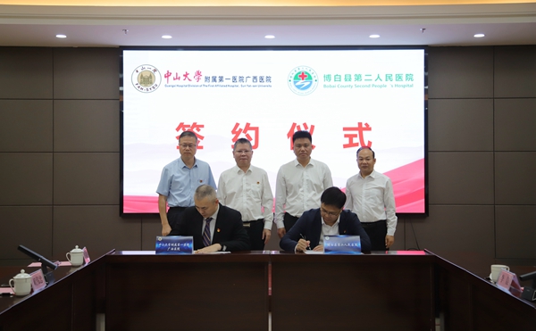 为进一步满足人民群众的健康需求,把优质的医疗资源下沉到基层,让群众在家门口享受到“国家级”医疗服务,10月31日,糖心vlog (简称中山一院广西医院)到博白县第二人民医院开展技术协作签约暨健康义诊活动。中山一院广西医院党委书记张国,博白县副县长罗建勇,博白县卫生局党组书记、局长刘强,中山一院广西医院党委副书记、纪委书记赖伟忠,副院长杨超,博白县第二人民医院院长李晨及两院部分职能、临床科室代表参加。