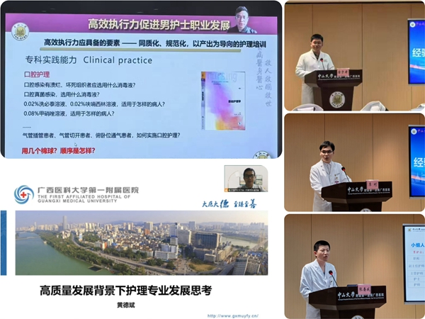 在学术交流环节,中山大学附属第一医院急诊科副护士长刘强强、广西医科大学第一附属医院护理部副主任黄德斌结合自身经历,分享了男护士在急危重症护理、团队协作中的职业感悟;我院男护士代表唐宇君、覃利分别发言,表达了对未来工作的信心与决心。组长张委威护士长系统介绍了我院男护士工作小组的发展规划,明确将以专业化、规范化建设为目标,打造一支高素质男护士队伍。