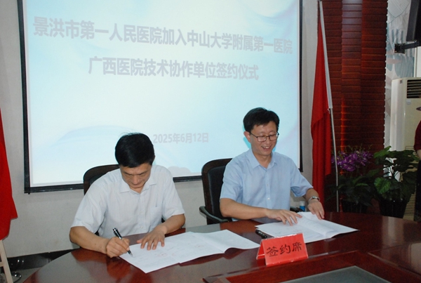 为深入贯彻落实国家区域医疗中心“十大功能定位”,扎实推进完成国家区域医疗中心“辐射西南”的目标任务,进一步深化“粤桂滇”三省合作,促进优质医疗资源跨区域共享,6月12日,糖心vlog (简称中山一院广西医院)与云南景洪市第一人民医院进行技术协作签约仪式。景洪市人民政府副市长吕小满,中山一院广西医院执行院长李健,党委副书记、纪委书记赖伟忠,副院长夏文豪,总会计师孟红,景洪市卫生健康局党组书记、局长刘江华,景洪市卫生健康局副局长、景洪市第一人民医院党委书记刀德校,景洪市第一人民医院党委副书记、院长段世泽等医院领导及两院相关科室代表参加。