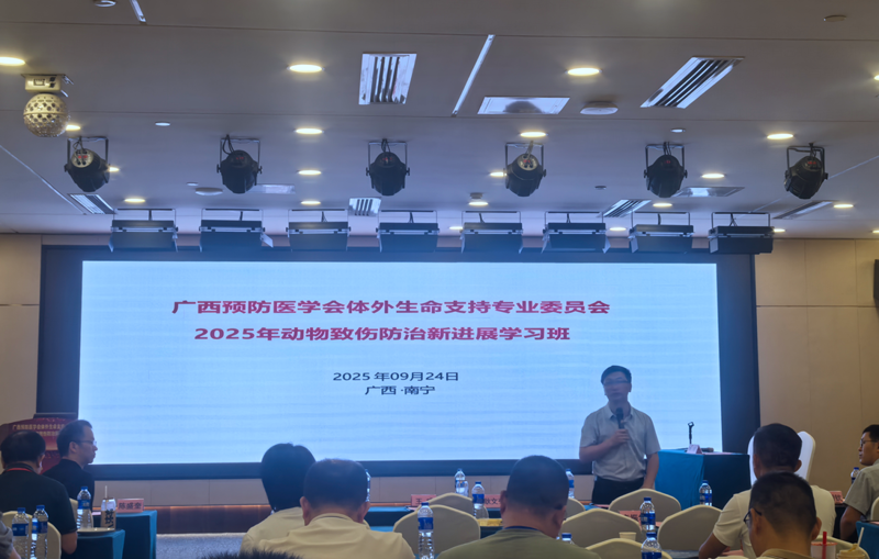 9月24日,由广西预防医学会主办、中山大学附属第一医院(简称中山一院)广西医院承办的广西预防医学会体外生命支持专业委员会2025年动物致伤防治新进展学习班在南宁举行。本次学习班围绕动物致伤防治的前沿动态与实用技术展开,旨在提升广西地区动物致伤相关疾病的诊疗水平,推动救治流程规范化。来自全区各级医疗机构急诊科、重症医学科、外科等近百名医务人员参会。会议由广西预防医学会体外生命支持专业委员会主任委员、中山一院广西医院急诊科执行主任朱瑞凯主持。
