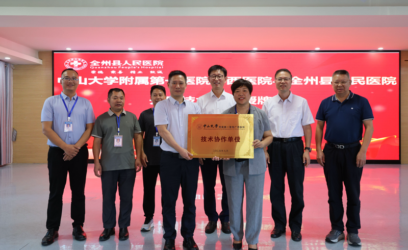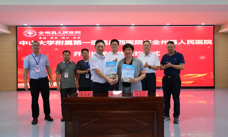 为推动优质医疗资源下沉基层,切实提升全州县县域内医疗服务能力与群众就医获得感,9月28日,中山大学附属第一医院(简称中山一院)广西医院与全州县人民医院技术协作协议签约仪式在全州县人民医院举行。中山一院广西医院执行院长李健,党委副书记、纪委书记赖伟忠,副院长夏文豪,全州县人民医院党委书记、院长蒋艳姣,农工党中山大学基层委员会专家以及中山一院广西医院、全州县人民医院相关科室负责人参加。