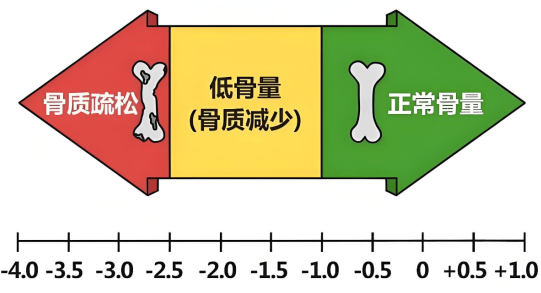 T值:与健康年轻人骨密度对比,正常≧1.0;骨量减少:-1~-2.5;骨质疏松:≦-2.5。骨密度需结合年龄、性别、用药史等综合判断。
