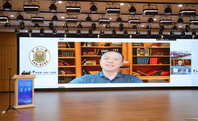 中山大学附属第七医院院长、党委副书记,中山一院耳鼻咽喉科学科带头人,“粤桂鼻颅底疾病多学科诊疗联盟”中心学术顾问文卫平教授通过线上为揭牌仪式致辞。他指出,鼻颅底疾病因病变部位深、解剖结构复杂,涉及耳鼻咽喉头颈外科、神经外科、影像科等多个学科,对诊疗团队的综合能力提出极高要求。而中山一院鼻专科作为中国内镜鼻窦外科创始单位,在鼻颅底外科领域开创多项技术先河,并拥有国内顶尖专家领衔的人才梯队。“粤桂鼻颅底疾病多学科诊疗联盟”成立后,将充分嫁接这一优质资源,建立涵盖粤桂两地多学科专家的协作网络,通过远程会诊、联合手术、病例研讨等形式,打破学科与地域壁垒,推动技术标准化与同质化建设。“粤桂鼻颅底疾病多学科诊疗联盟” 的成立,不是简单的 “技术输出”,而是粤桂两地医疗资源的 “深度融合”,希望联盟各单位共同聚焦合作发展的核心目标,让鼻颅底疾病诊疗的“粤桂模式”,成为跨省份专科联盟提供可复制路径,一同为保障人民群众健康做出更大贡献。