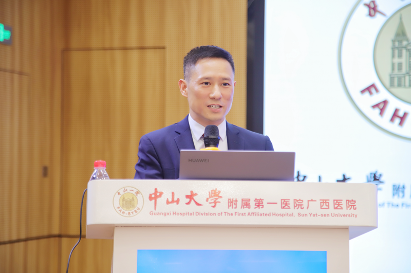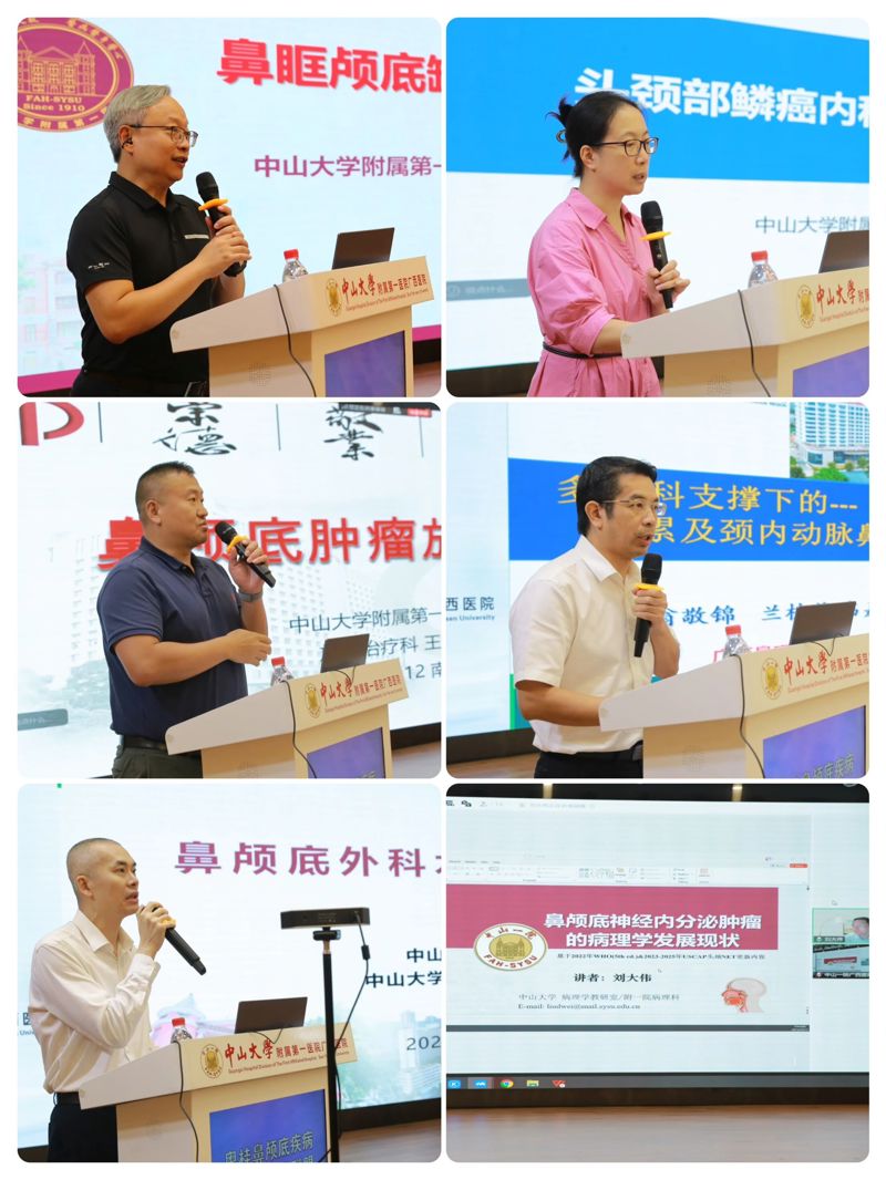 揭牌仪式结束后,中山一院神经外科郭少雷教授、肿瘤科龙健婷教授、放疗科王岩教授,广西壮族自治区人民医院副院长瞿申红教授,中山一院广西医院副院长杨超教授分别以《鼻眶颅底缺损修复探讨》《头颈部鳞癌内科治疗2025更新要点》《鼻颅底肿瘤放疗现状》《多学科支撑下的累及颈内动脉鼻咽癌相关病灶的外科策略》《鼻颅底外科术后水盐代谢紊乱》为主题进行授课分享。中山一院病理科刘大伟教授通过线上方式分享了《鼻颅底神经内分泌肿瘤的病理学发展现状》的内容。