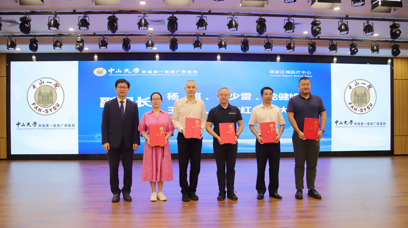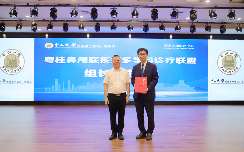 中山一院广西医院党委书记张国给“粤桂鼻颅底疾病多学科诊疗联盟”组长李健颁发聘书。