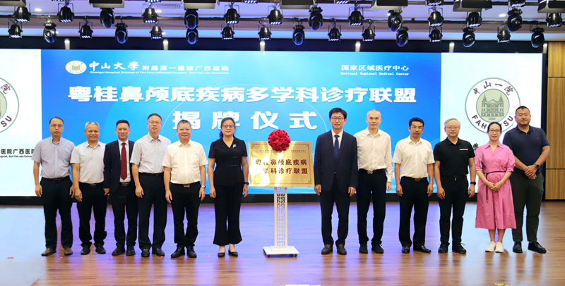仪式现场,与会领导、嘉宾及联盟成员单位专家代表共同为联盟揭牌。此次”粤桂鼻颅底疾病多学科诊疗联盟”揭牌仪式获得了来自广州、深圳、西安以及广西区内的60多位专家学者的加盟和大力支持。