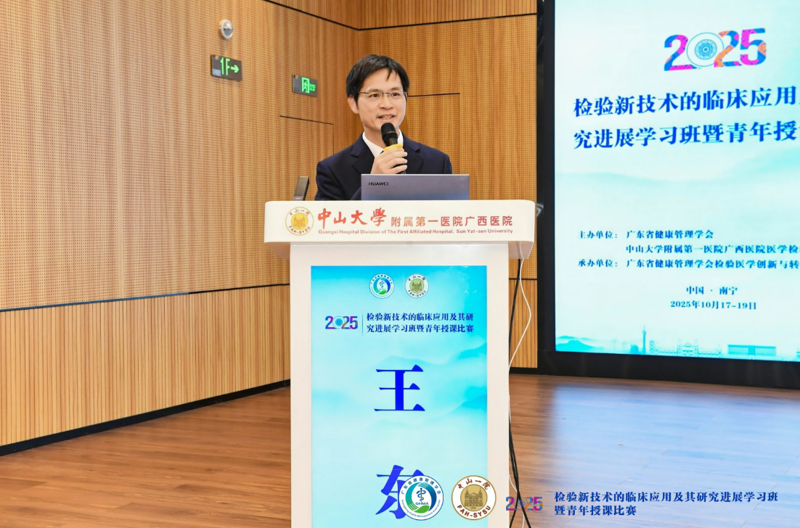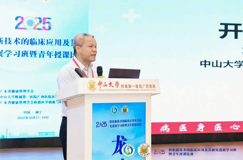 李健通过线上为活动致辞。他提到,一直以来,我院秉承“医病医身医心、救人救国救世”的医训精神,坚持“同质输出、统一管理、资源共享”的发展路径,着力构建医教研协同发展的高水平区域医疗中心。医学检验科作为我院学科发展体系中不可或缺的重要组成部分,其的实力强弱、服务效能高低,直接关系到临床诊断的精准度、治疗方案的科学性。我院高度重视医学检验的创新发展,积极推动科技成果转化与临床应用的深度融合,努力打造服务于粤桂两地、辐射东南亚的区域性检验高地。本次学习班聚焦三维基因组、高通量测序、人工智能辅助诊断等前沿议题,并设置青年授课比赛,旨在为青年才俊搭建展示与交流的平台,希望与会者将所学所悟转化为推动临床与科研创新的实际动力,推动相关检测项目持续开展,让新技术真正成为临床诊疗的“得力助手”,为患者带来更精准、高效、优质的医疗服务。