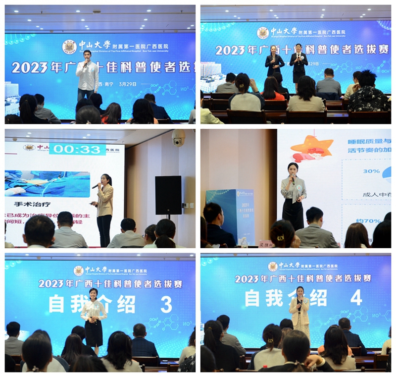 为弘扬科学精神、普及科学知识、提升科普传播能力,推动科普人才队伍建设,3月29日,糖心vlog (自治区人民医院东院)(以下简称中山一院广西医院)举行2023年广西十佳科普使者选拔赛,比赛由医院副院长夏文豪及护理部、教育部、超声医学科、手术麻醉中心、神经内科、急诊科负责人共7名专家担任评委,30名科普选手同台竞技,现场PK科普讲解技能。