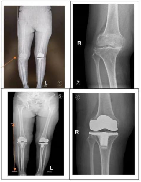 ▲图①、图②患者术前影像资料显示患者右膝退变严重;图③、图④术后资料显示置换后假体位置良好,双下肢力线良好