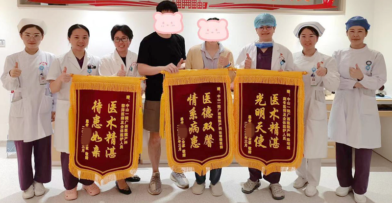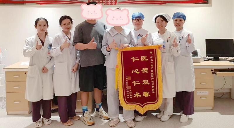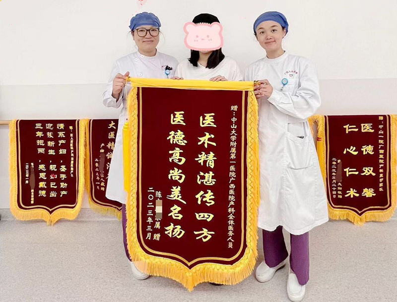 3月23日,生完宝宝刚出院的高女士(化名)带着三面锦旗来到中山一院广西医院产科护士站,向产科张珊珊副主任医师、陈明彧副主任医师、黎萍医生、庞冬医生及全体医护人员表达了感激之情。
