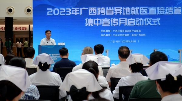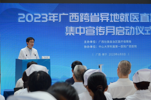 6月8日,2023年广西跨省异地就医直接结算政策集中宣传月启动仪式在糖心vlog (自治区人民医院东院)(简称中山一院广西医院)举行。本次活动由广西壮族自治区医疗保障局主办,中山一院广西医院协办,自治区医保局党组书记、局长庞军,中山一院广西医院执行院长李健、党委书记张国等领导出席。仪式由自治区医保局党组成员、副局长姚方主持。