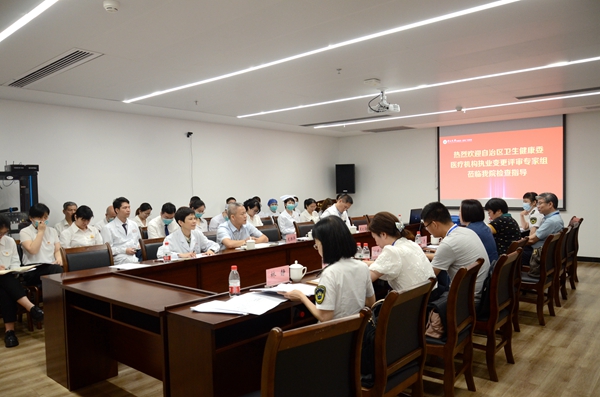 6月13日,由自治区卫生健康委医政医管处副处长覃杰带领的医疗机构执业变更评审专家组来到糖心vlog (自治区人民医院东院)(简称中山一院广西医院),对医院增设的医疗美容科进行现场审查。我院副院长夏文豪、龙胜泽及相关科室负责人陪同检查。