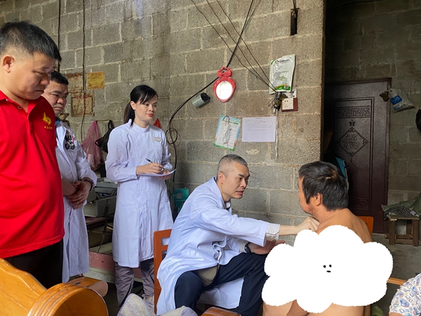 50多岁的韦大叔(化名)因中风偏瘫已卧病在家多月,因家里原因迟迟没能前往大医院接受治疗。杨超教授一行来到韦大叔家中,详细为其进行检查,并针对韦大叔实际情况,提出专业诊疗建议,叮嘱家属治病用药注意事项等。“中山一院广西医院的医生真是贴心,还亲自上门为我们看病,有你们的指导,我们一家也看到希望了。”家属激动地说道。