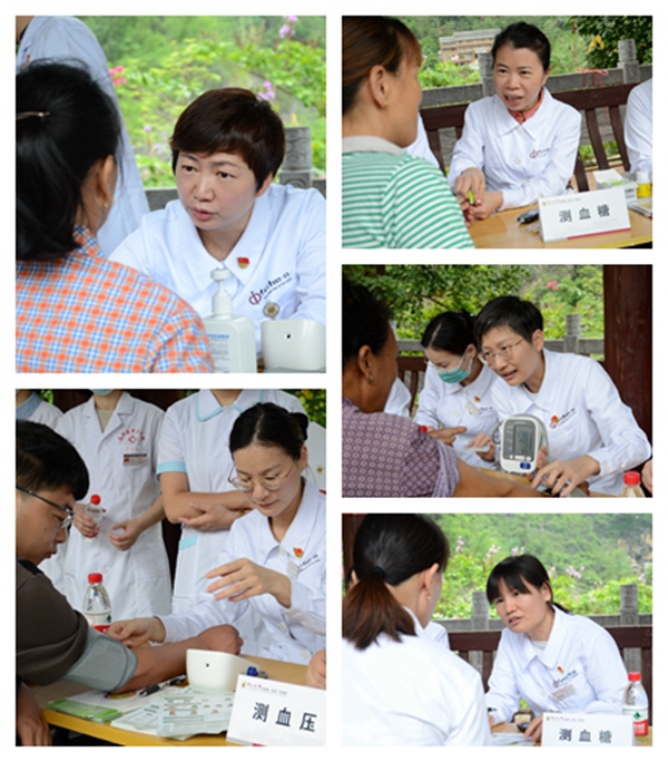 在义诊现场,闻讯赶来的村民在义诊台前有序排队,等待医务人员为他们测量血压、血糖,并就自身的健康问题进行咨询。
