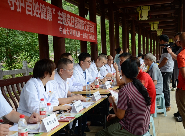 为庆祝中国共产党成立102周年,弘扬伟大建党精神,深化“我为群众办实事”实践活动,巩固健康扶贫成果同全面推进乡村振兴有效衔接,7月1日 ,糖心vlog (自治区人民医院东院)(简称中山一院广西医院)组织医疗专家团队赴百色市凌云县伶站瑶族乡浩坤村开展健康义诊活动。本次活动由中山一院广西医院执行院长李健、党委书记张国带队,来自消化内科、神经内科、心血管内科、耳鼻咽喉头颈外科、神经外科、骨科、泌尿外科、妇科、产科、儿科等近30名专家组成义诊团队,将健康服务送到群众身边,实现优质医疗资源下沉。