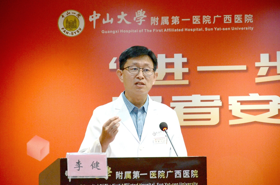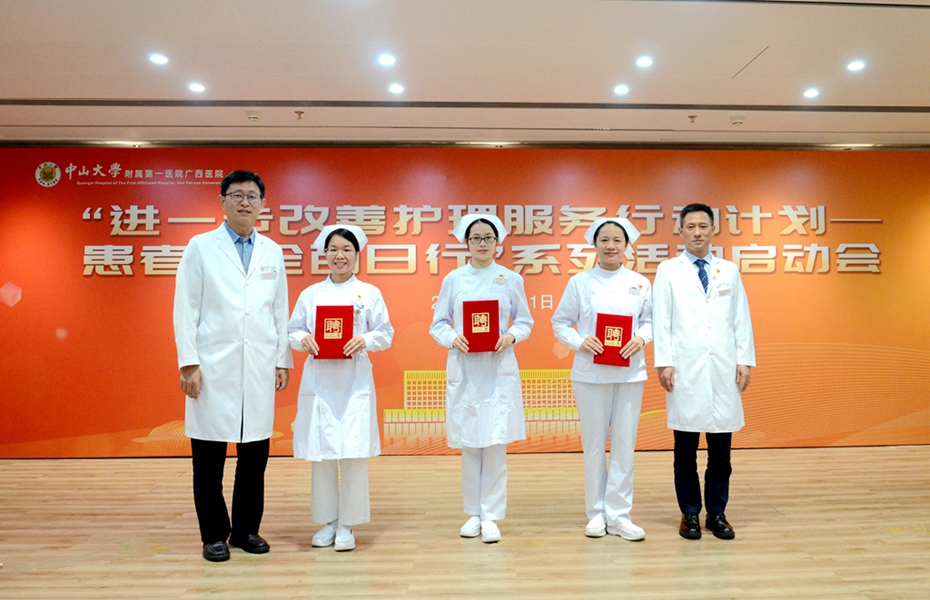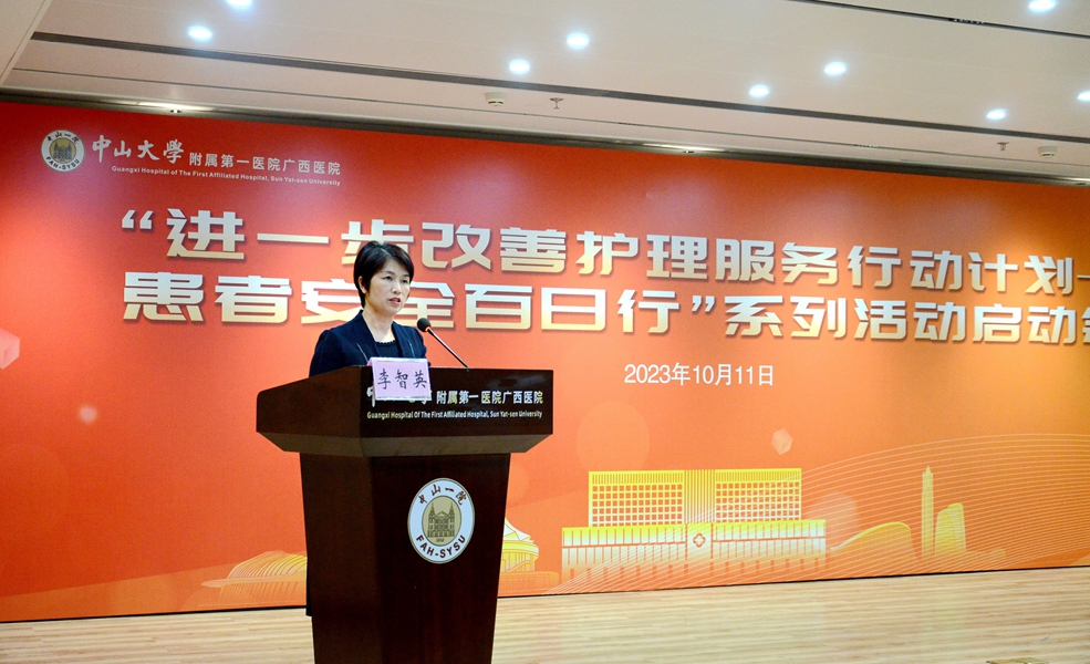 (自治区人民医院东院)(简称中山一院广西医院)护理部召开“进一步改善护理服务行动计划——患者安全百日行”系列活动启动会。我院执行院长李健,党委副书记、纪委书记赖伟忠,副院长杨超、夏文豪、龙胜泽以及相关职能科室负责人、病区主任、护士长、业务骨干等参加。会议由护理部主任李智英主持。