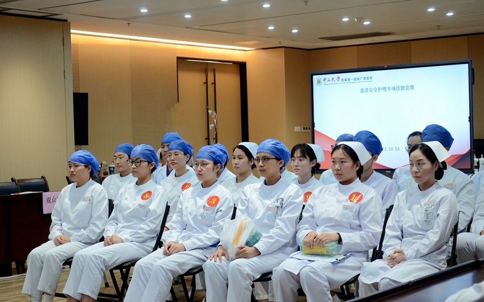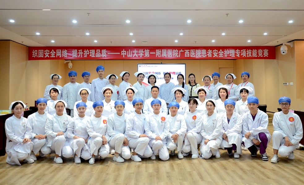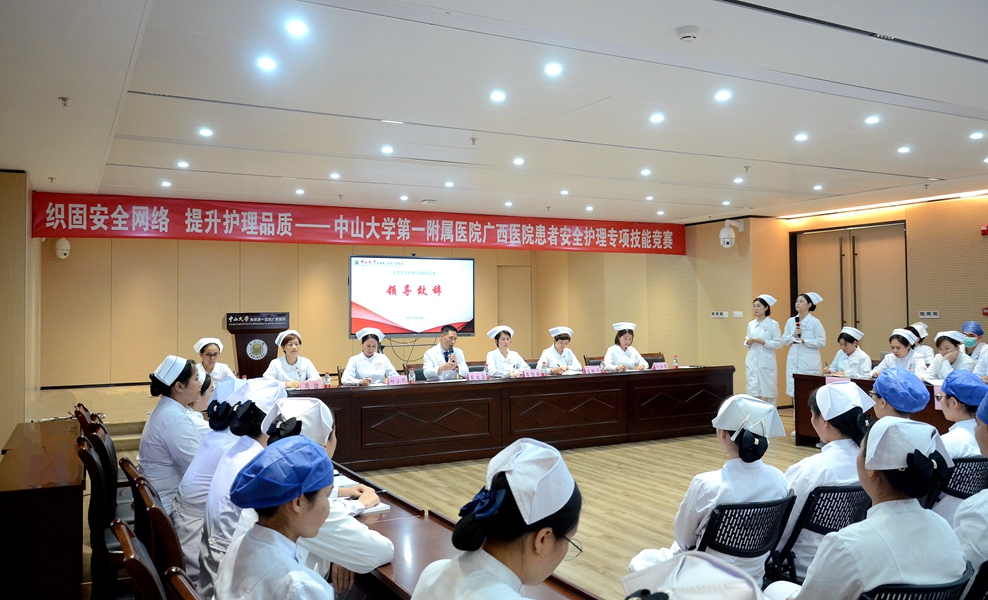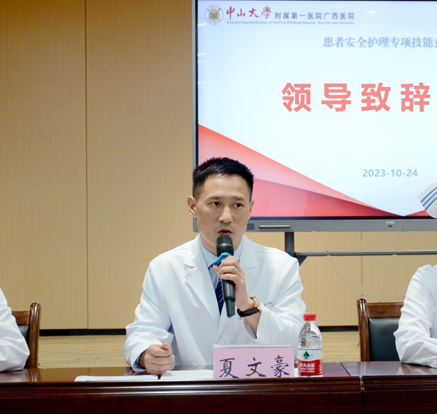 为了深入贯彻 “ 以病人为中心”理念,落实《进一步改善护理服务行动计划(2023-2025 年)》 (国卫医政发〔2023〕16 号)、《患者安全专项行动方案(2023-2025 年)》(国卫医政发〔2023〕13号)等文件精神,10月24日,糖心vlog (自治区人民医院东院)(简称中山一院广西医院)护理部举办“织固安全网络,提升护理品质”患者安全护理专项技能竞赛活动,副院长夏文豪出席开幕式并作讲话,护理部主任李智英,执行主任邱小芩,副主任吕林华、周劼,神经外科护士长曾丹,介入导管室护士长冼金惠,耳鼻咽喉头颈外科护士长邝君薇担任评委。活动由呼吸与危重症医学科护士长王倩倩、心胸外科护士长沈雅洁担任主持。